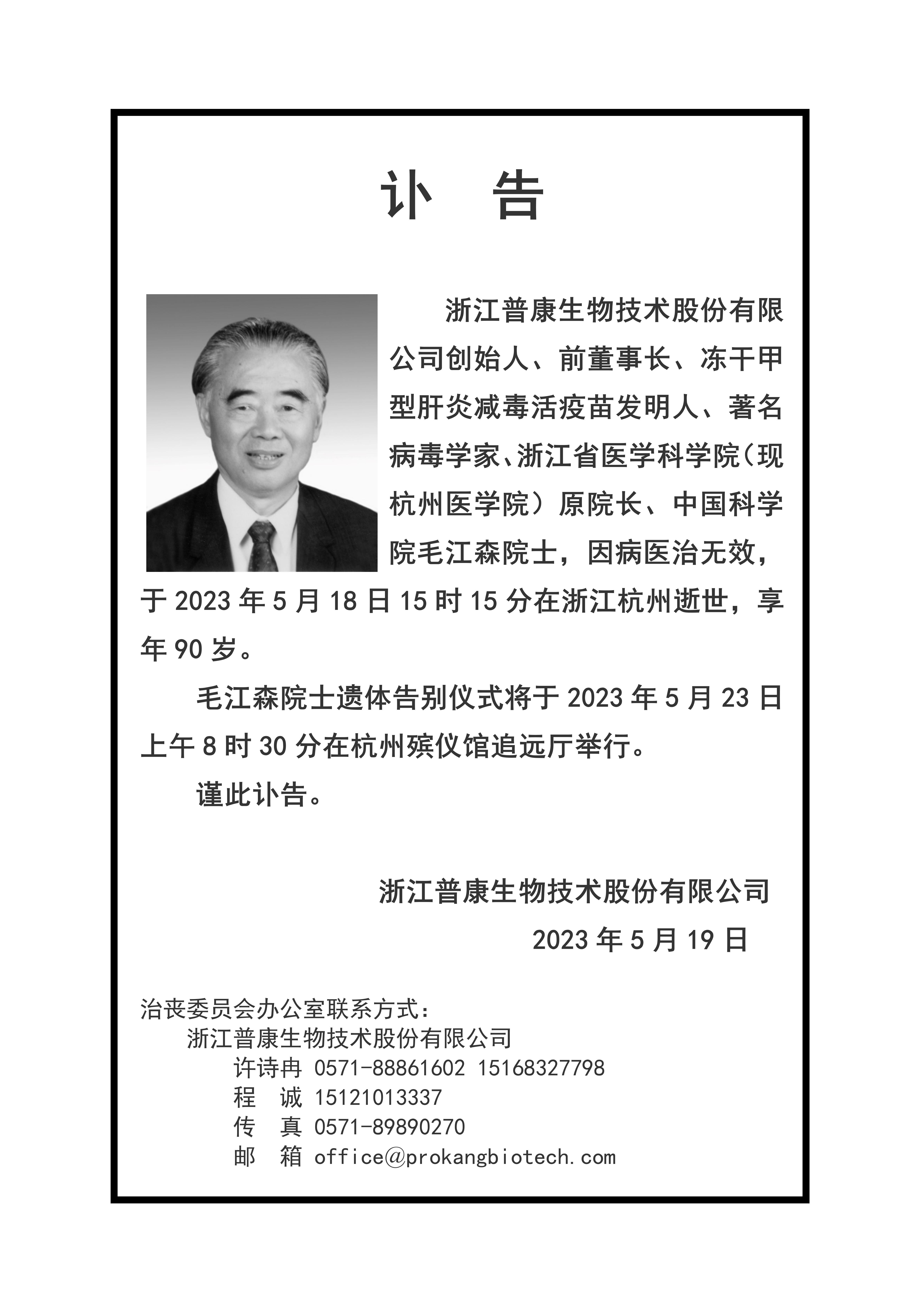 毛江森院士治丧委员会公告