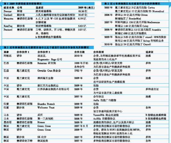 2009年H1N1流感的爆发,使得流感疫苗厂商的销售收入有了大幅度的增加,其中葛兰素史克、赛诺菲巴斯德和诺华三家公司流感疫苗的销售总额在2009年和2010年上半年达到了64亿美元。然而,这样的高收益可能维持不长,据说2010年流感疫苗的储备量有大幅度的下滑现象。此外,几个高品质的新型疫苗产品表现得尤其成功,辉瑞的Prevnar和默沙东的Gardasil已经跻身于重磅炸弹的行列。在2009年这两个产品的销售额都超过了15亿美元。