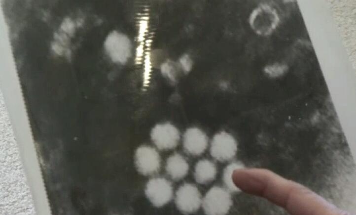 是一张让毛江森毕生难忘的照片,画面中间的白色块状物,就是被放大了4万倍的甲肝病毒。