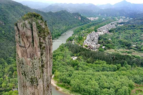 繁华落尽,青果枝头挂。按理谷雨这个时节多是缠缠绵绵的细雨,但是出游当天,却是难得的晴朗。历经三个多小时的车程,大家抵达了第一个国家4A 级景区—仙都风景名胜区,坐标缙云。大家跟随导游坐景区接泊公交巴士前往各个景点,第一个映入眼帘的当然是仙都的核心景点——鼎湖峰,又名独峰、丹峰,俗称石笋。东峙步虚山,西临练溪水,为一亿六千万年前火山喷溢堆积的流纹岩台地,经地质外力作用而形成柱峰奇观,被誉为“天下第一峰”。峰巅苍松翠柏间蓄水成池,四时不竭。故名鼎湖,峰亦因之。