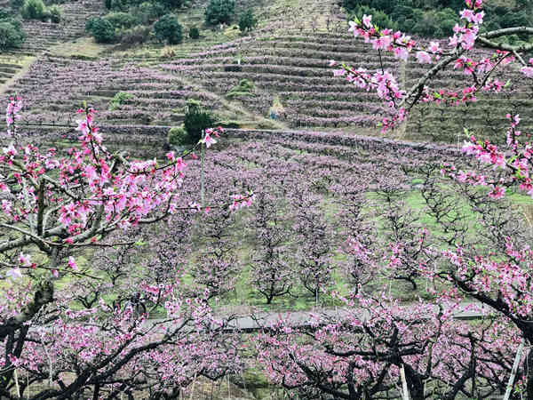 次日,我们来到奉化林家村寻找桃花源,天下桃花在奉化,奉化桃花在林家,果不其然,刚下车,映入眼帘的是数千亩桃园,依山势连绵起伏成片,层层叠叠,错落有致。我们在桃园的游步道上赏花漫步,远观气势磅礴,花海如潮,近看粉脂嫣红,妩媚争艳,果然有天下第一桃园的美誉。整个桃园就如唐朝诗人杨巨源所写的“若待上林花似锦,出门俱是看花人”。